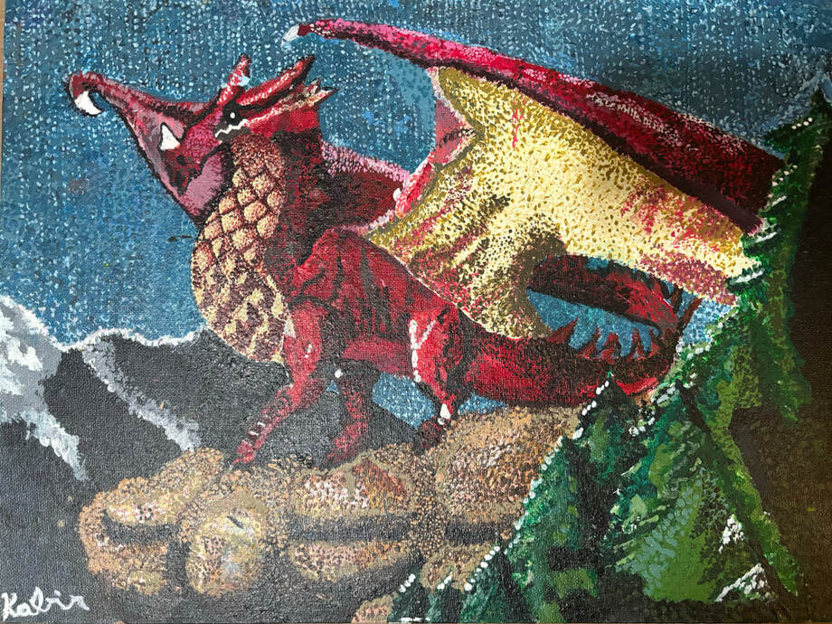 Further exploring stippling techniques, I stipple-painted a dragon perched upon a cliff. Upon close inspection, it’s easy to notice the imperfections and little brush strokes, however looking at the picture as a whole, everything blends together to form the picture.