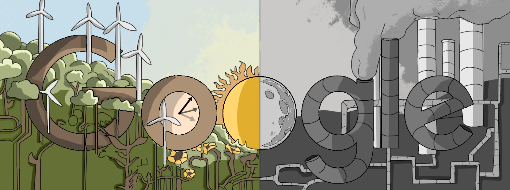This digital piece done on Photoshop was my submission for the 2024 Google Doodle contest, “My Wish for the Next 25 Years.” It represents a change from nonrenewable energy sources to a cleaner world embedded into the classic google logo.