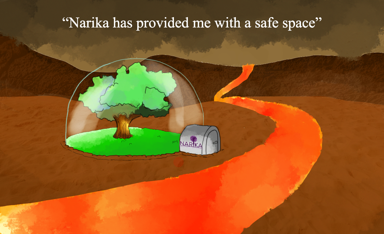 Narika organization that helps women who have been in abusive relationships. Every year, they host an annual banquet to raise money, where my artwork was featured in order to create awareness and draw people to the event. It depicts a bubble in the middle of a hellscape representing Narika’s place in helping people who have suffered with domestic violence. This piece was created on photoshop.