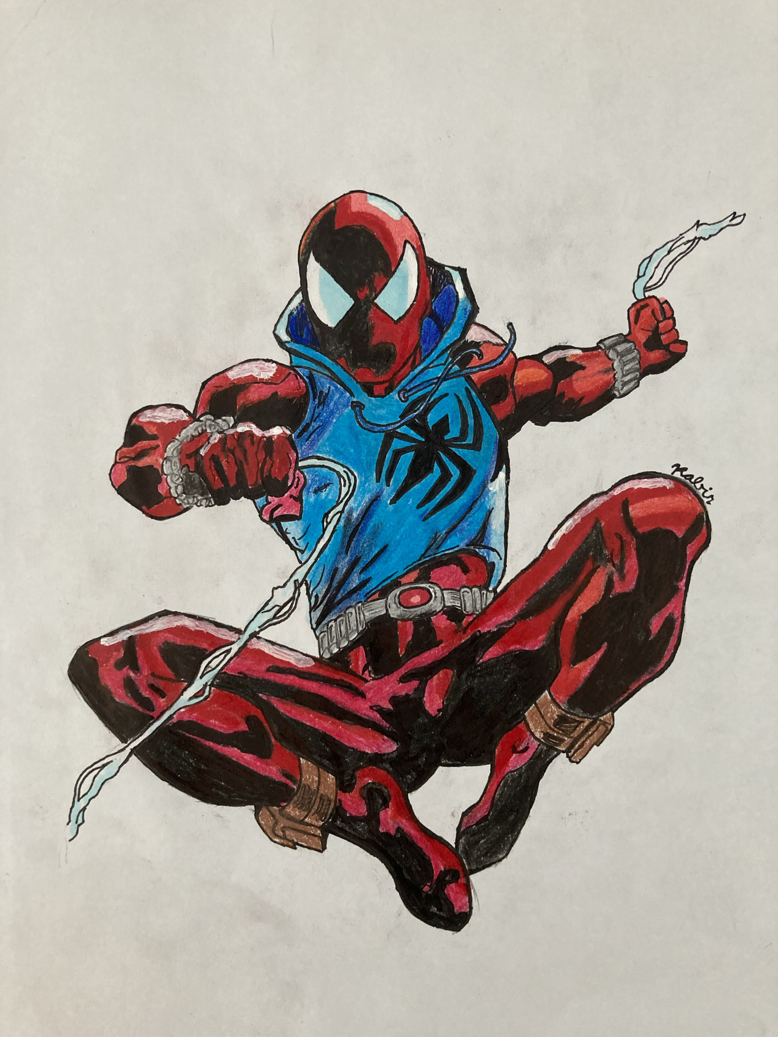 Upon watching Spider-Man: Across the Spider-Verse, the Scarlet Spider immediately caught my eye because he had one of the most well-designed Spider-Suits. I watched this movie an additional two times before creating this drawing, based on the first issue comic cover of the Scarlet Spider. This was done on paper with a combination of colored pencil and Copic Markers.
