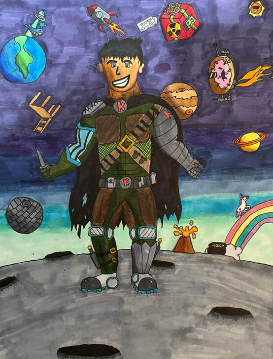 In fifth grade, I created a self-portrait of who I imagined I would be in a futuristic, dystopian world. My armor consists of a combination of both realistic military features and those of superheroes that I liked. Additionally, there are multiple doodles done in the background representing times when I got distracted and started messing around. Overall, this piece encompasses a lot of the personality and niche interests that I had at that age, and was fully done in Copic Markets.