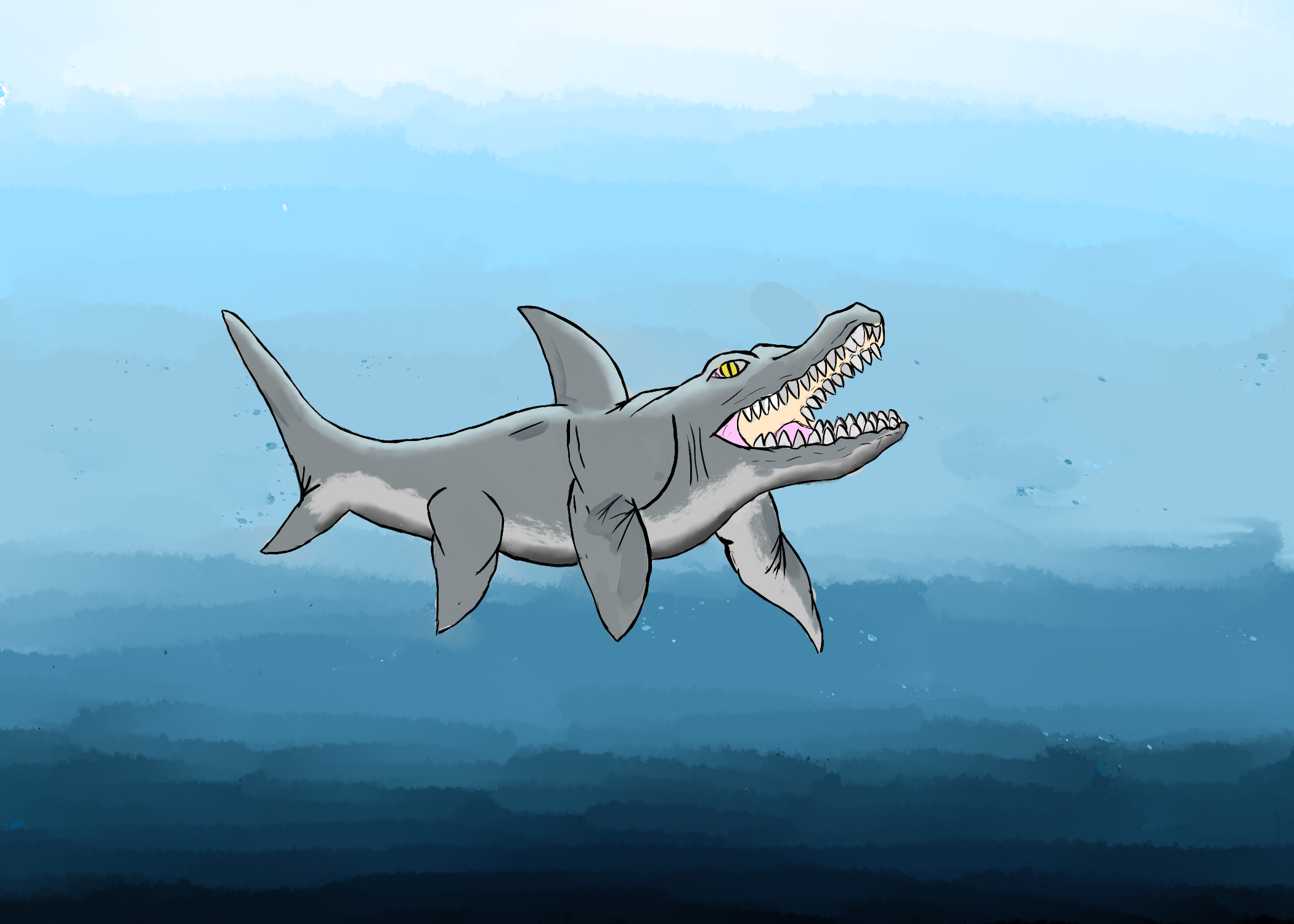 Upon first getting Adobe Photoshop, I was thinking about interesting things to draw when I came up with the idea of a mix between the shark and the crocodile. My first ever photoshop drawing was a concept of this animal against a blue ocean background.