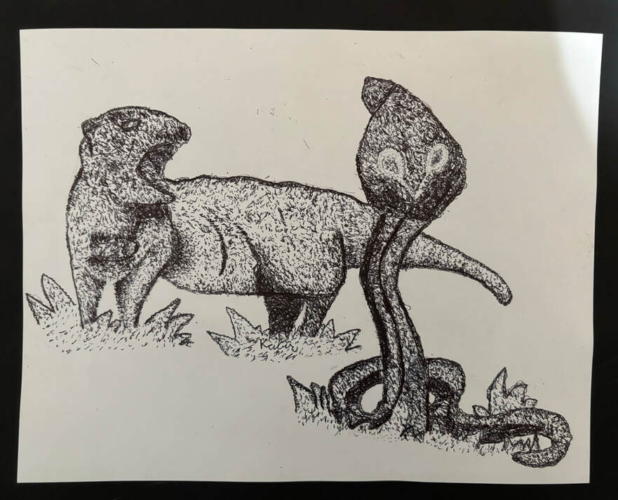 In fourth grade, I learned stippling, a technique that uses different concentrations of dots for various shades of color. A higher concentration results in a darker area, and the lower the concentration, the lighter. This piece represents the iconic rivalry between snakes and mongooses.