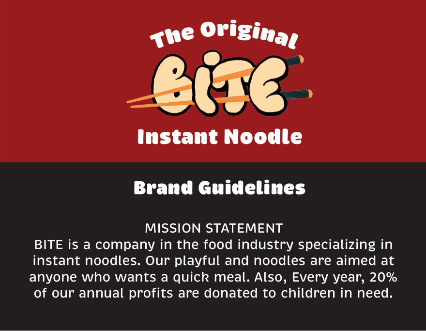 Upon doing some research about graphic design and mockups, I took it on myself to create a concept of a brand that encompassed some of my art and design skill. This graphic shows the brand guidelines of an imaginary instant noodle company called Bite.